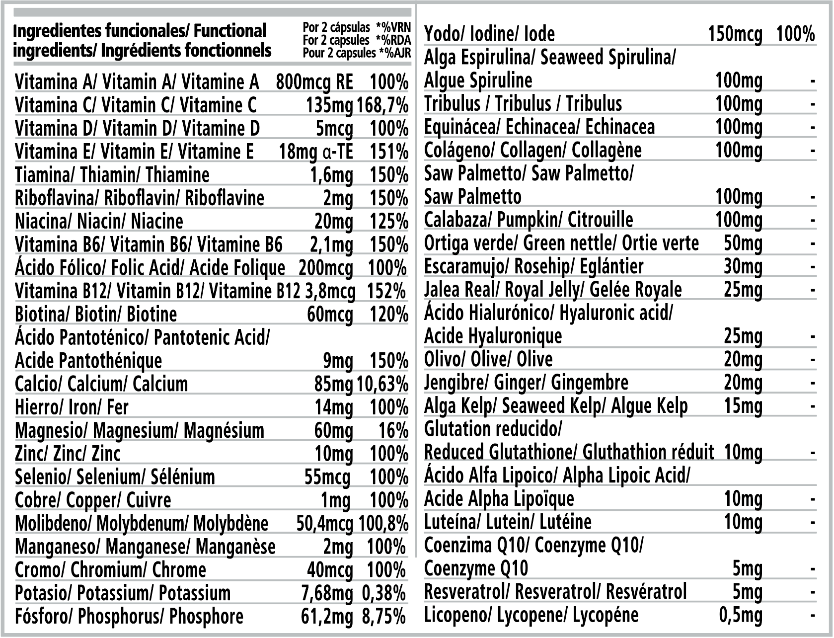 Ingredientes: Fosfato dicálcico, Gelatina*, Vitamina C (Ácido L-Ascórbico), Óxido de magnesio, Alga Espirulina en polvo (Arthrospira platensis), Extracto seco de Equinácea (Echinacea purpurea (L.) Moench,, 4% Polifenoles), Extracto seco de Tribulus (Tribulus terrestris L., 40% Saponinas), Colágeno hidrolizado, Extracto seco de Saw Palmetto (Serenoa repens (W.Bartram) Small, 45% Ácidos grasos), Extracto seco de Calabaza 5:1 (Curcubita pepo L.), Vitamina E (Acetato de DL-alfa-tocoferilo), Extracto seco de Tagete (Tagetes erecta L. 20% Luteína), Extracto seco de Ortiga verde (Urtica dioica L 1% Silicio), Gluconato de potasio, Fumarato ferroso, Extracto seco de Escaramujo (Rose canina L., 50% Vitamina C.), Jalea real liofilizada, Hialuronato sódico, Antiaglomerante (Sales magnésicas de ácidos grasos), Extracto seco de Polygonum (Fallopia japonica (Houtt.) Ronse Dec, 25% Resveratrol), Extracto seco de Jengibre (Zingiber officinale Rosc., 6% Gingeroles), Extracto seco de Olivo (Olea europea L., 6% Oleuropeína), Niacina (Nicotinamida), Gluconato de manganeso, Alga Kelp en polvo (Ascophyllum nodosum, 920mg/Kg Yodo), Óxido de zinc, Extracto seco de Tomatera (Solanum licopersicum, 5% Licopeno), Ácido alfa lipoico, L-Glutatión reducido, Ácido Pantoténico (D-Pantotenato cálcico), Antiaglomerante (Dióxido de silicio), Vitamina A (Acetato de retinilo), Coenzima Q10 (Ubiquinona), Vitamina B6 (Clorhidrato de piridoxina), Sulfato cúprico, Vitamina B2 (Riboflavina), Tiamina (Clorhidrato de tiamina), Vitamina D3 (Colecalciferol), Molibdato de sodio (Molibdeno VI), Vitamina B12 (Cianocobalamina), Colorantes* (Óxido de hierro negro y Azul brillante FCF), Picolinato de cromo, Ácido Fólico (Ácido Pteroilmonoglutámico), Yoduro de potasio, Selenito de sodio y Biotina (D-biotina). *Componentes de la cápsula. Ingredients: Dicalcium phosphate, Gelatin*, Vitamin C (L-Ascorbic acid), Magnesium oxide, Spirulina algae powder (Arthrospira platensis), Echinacea dry extract (Echinacea purpurea (L.) Moench, 4% Polyphenols), Tribulus dry extract (Tribulus terrestris L., 40% Saponins), Hydrolyzed collagen, Saw Palmetto dry extract (Serenoa repens (W.Bartram) Small, 45% Fatty Acids), Pumpkin dry extract 5:1 (Curcubita pepo L.), Vitamin E (DL Acetate -alpha-tocopheryl), Tagete dry extract (Tagetes erecta L. 20% Lutein), Green nettle dry extract (Urtica dioica L 1% Silicon), Potassium gluconate, Ferrous fumarate, Rose hips dry extract (Rose canina L. , 50% Vitamin C.), Lyophilized royal jelly, Sodium hyaluronate, Anti-caking agent (Magnesium salts of fatty acids), Polygonum dry extract (Fallopia japonica (Houtt.) Ronse Dec, 25% Resveratrol), Ginger dry extract (Zingiber officinale Rosc., 6% Gingerols), Olive dry extract (Olea europea L., 6% Oleuropein), Niacin (Nicotinamide), Manganese gluconate, Kelp seaweed powder (Ascophyllum nodosum, 920mg/Kg Iodine), Zinc oxide, Tomato dry extract (Solanum licopersicum, 5% Lycopene), Alpha lipoic acid, Reduced L-Glutathione, Pantothenic acid (Calcium D-Pantothenate), Anti-caking agent (Silicon dioxide), Vitamin A (Retinyl acetate), Coenzyme Q10 (Ubiquinone), Vitamin B6 (Pyridoxine hydrochloride), Cupric sulfate, Vitamin B2 (Riboflavin), Thiamine (Thiamine hydrochloride), Vitamin D3 (Cholecalciferol), Sodium molybdate (Molybdenum VI), Vitamin B12 (Cyanocobalamin), Colorants* (Oxide black iron and Brilliant blue FCF), Chromium Picolinate, Folic acid (Pteroylmonoglutamic acid), Potassium iodide, Sodium selenite and Biotin (D-Biotin). *Capsule components. Ingrédients : Phosphate dicalcique, Gélatine*, Vitamine C (Acide L-ascorbique), Oxyde de magnésium, Poudre d'algues spiruline (Arthrospira platensis), Extrait sec d'Echinacea (Echinacea purpurea (L.) Moench. 4% Polifenois),, Extrait sec de Tribulus (Tribulus terrestris L., 40 % de saponines), Collagène hydrolysé, Extrait sec de Palmier nain (Serenoa repens (W.Bartram) Small, 45 % d'acides gras), Extrait sec de Citrouille 5:1 (Curcubita pepo L.), Vitamine E (Acétate DL -alpha-tocophérol), Extrait sec de Tagete (Tagetes erecta L. 20% Lutéine), Extrait sec d'Ortie verte (Urtica dioica L. 1% Silicium), Gluconate de potassium, Fumarate ferreux, Extrait sec d'Églantier (Rose canina L., 50% Vitamine C.) , Gelée royale lyophilisée, Hyaluronate de sodium, Anti-agglomérant (Sels de magnésium d'acides gras), Extrait sec de Polygonum (Fallopia japonica (Houtt.) Ronse Dec, 25% Resvératrol), Extrait sec de Gingembre (Zingiber officinale Rosc., 6 % Gingérols), Extrait sec d'Olive (Olea europea L., 6% Oleuropéine), Niacine (Nicotinamide), Gluconate de manganèse, Poudre d'algue de Varech (Ascophyllum nodosum, 920 mg/Kg d'iode), Oxyde de zinc, Extrait sec de Tomate (Solanum licopersicum, 5 % Lycopène), Acide alpha-lipoïque, L-Glutathion réduit, Acide Pantothénique (D-Pantothénate de calcium), Antiagglomérant (Dioxyde de silicium), Vitamine A (Acétate de rétinyle), Coenzyme Q10 (Ubiquinone), Vitamine B6 (Chlorhydrate de pyridoxine), Sulfate de cuivre, Vitamine B2 (Riboflavine), Thiamine (Chlorhydrate de thiamine), Vitamine D3 (Cholécalciférol), Molybdate de sodium (Molybdène VI), Vitamine B12 (Cyanocobalamine), Colorants* (Oxyde de fer noir et Bleu brillant FCF), Picolinate de chrome, Acide folique (Acide Ptéroylmonoglutamique), Iodure de potassium, Sélénite de sodium et Biotine (D-biotine). *Composants des capsules. Peso neto: 59,28g. Net weight: 59,28g. Poids net: 59,28g. Presentación: 60 cápsulas de 988mg. Presentation: 60 capsules of 988mg. Présentation: 60 capsules de 988mg.